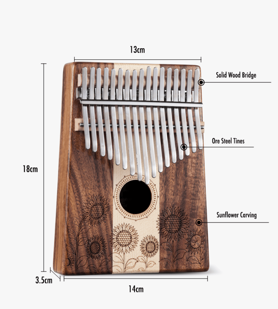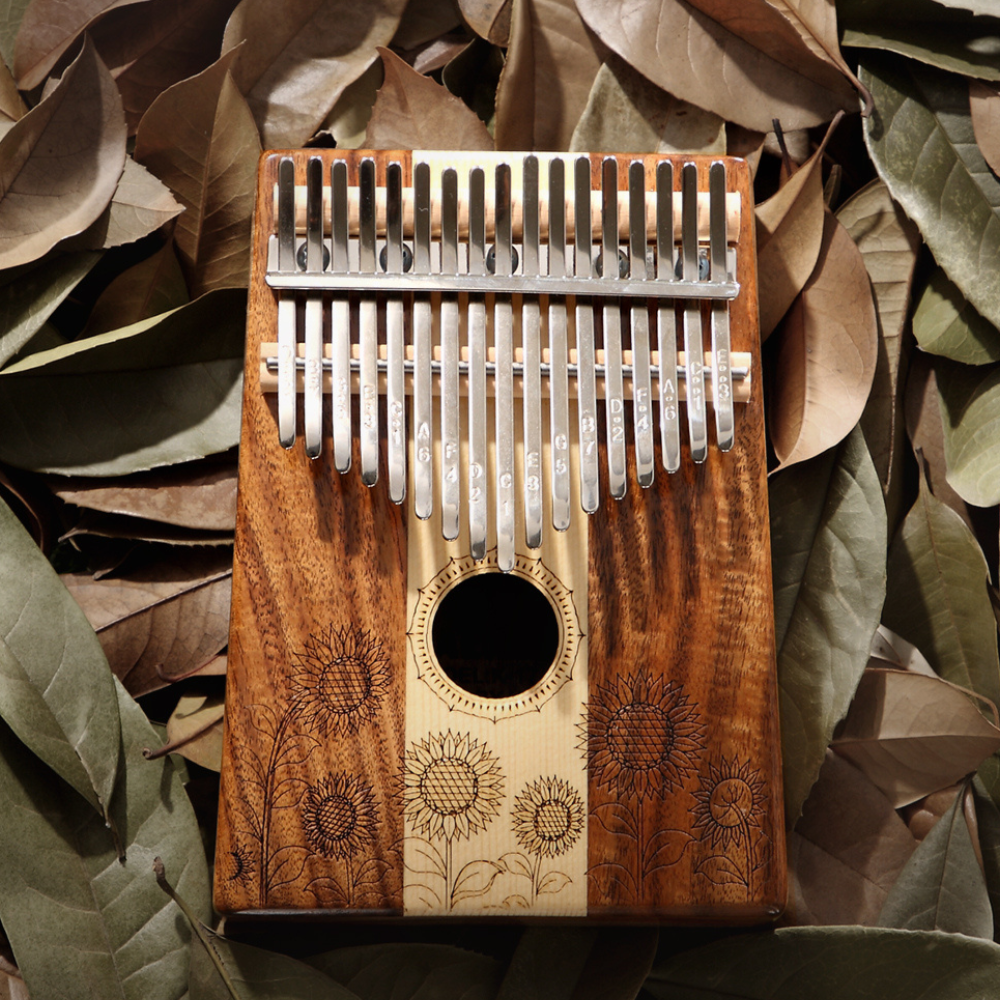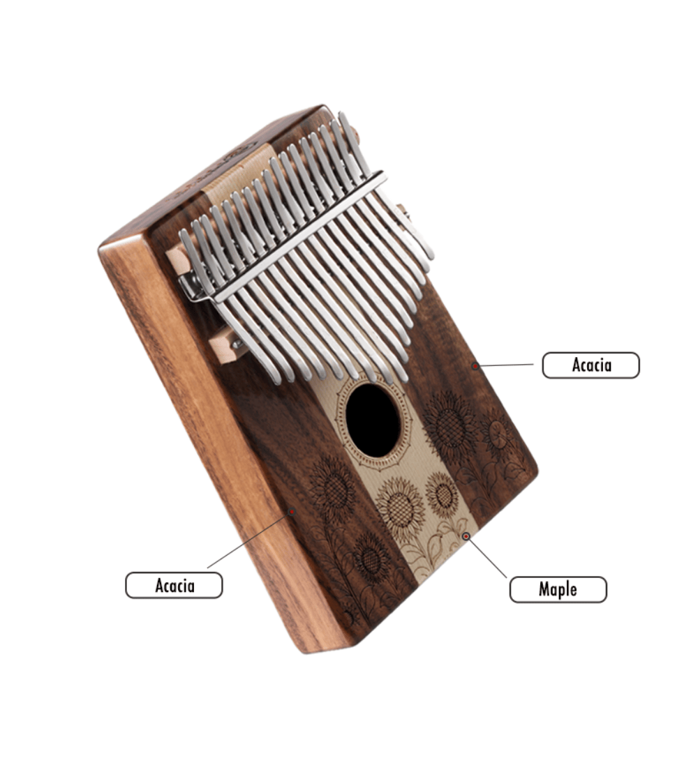 Hluru kalimba has exquisite workmanship with the most interesting designs. This 17 Key Acacia Maple Hluru Kalimba has a unique mixed wood design with beautiful sunflower carving. The wood used in this model is high-quality solid Acacia and Maple.