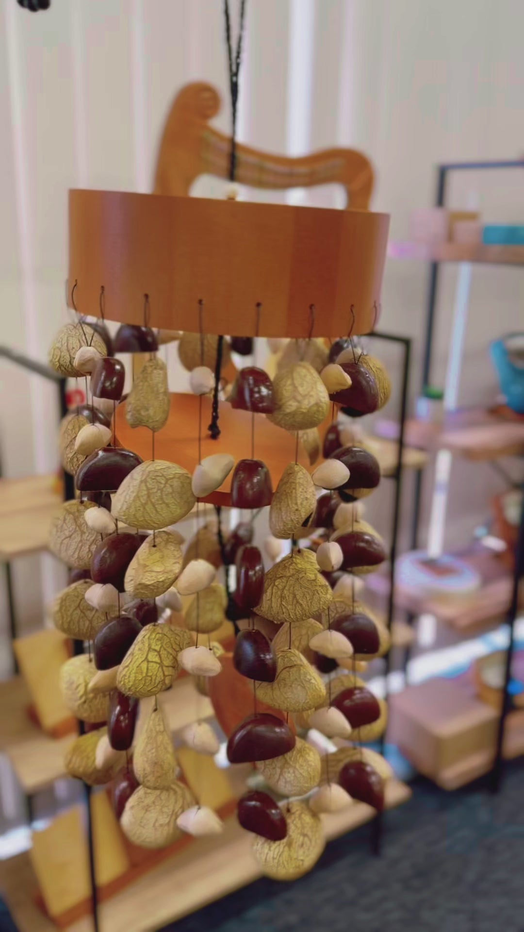- Materials: 20 strands × 6 pods each, suspended from a natural wooden ring.